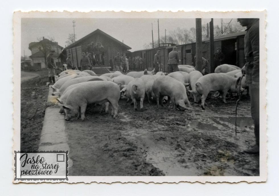Zdjęcie małoobrazkowe: 6.0 X 9.0 cm. Załadunek świń do wagonów kolejowych. Załadunku dokonują żołnierze niemieccy.