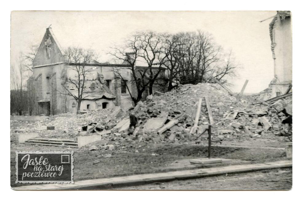 Ruiny kościoła parafialnego. Po prawej stronie zwały gruzu po ratuszu. Zdjęcie po renowacji.