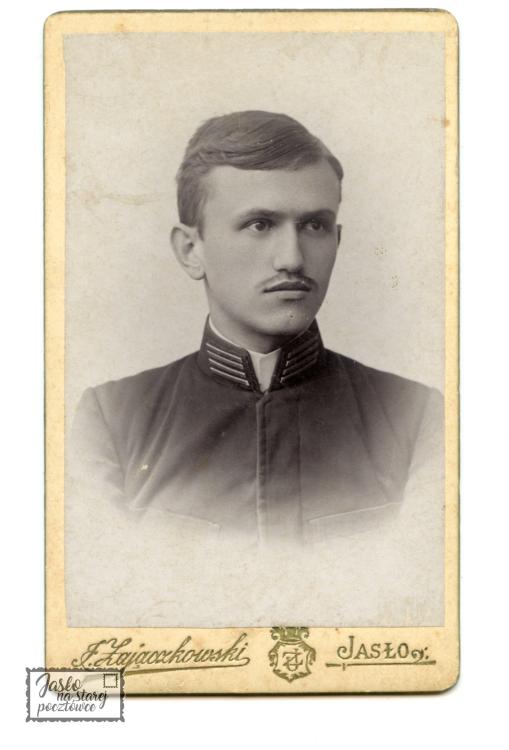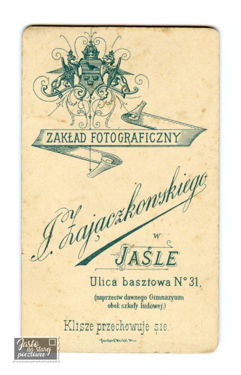 Zdjęcie na kartoniku o wymiarach: 6.5 X 10.6 cm. Z najpopularniejszą na rewersie litografią B. Wachtla (1852-1920). Zakład fotograficzny Jasło ul. Basztowa nr. 31 naprzeciwko dawnego Gimnazyum, obok szkoły ludowej.