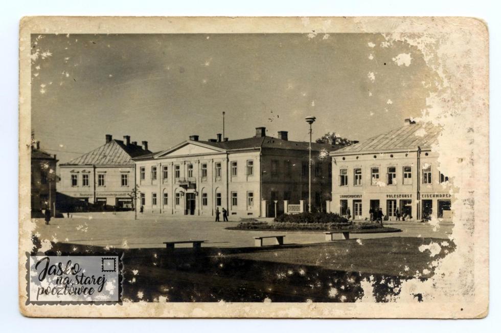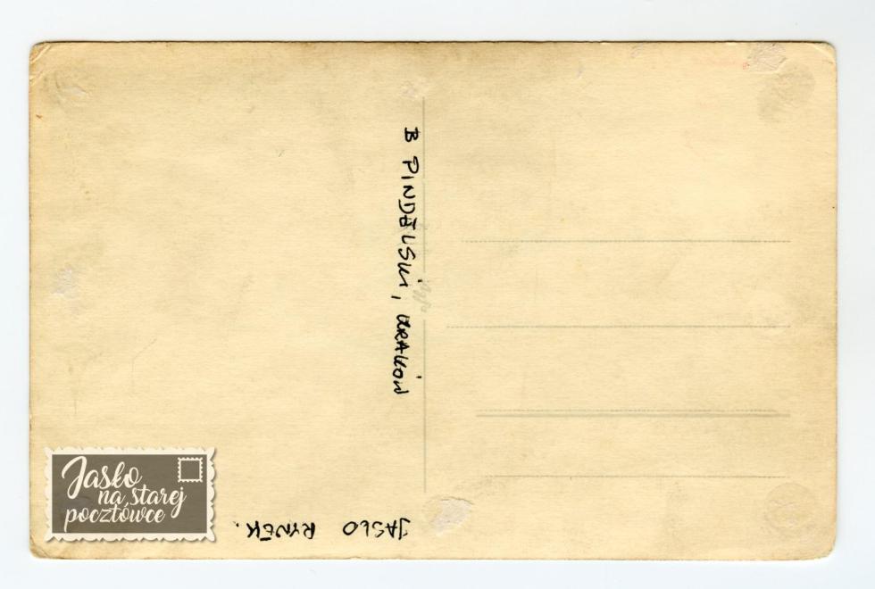Po lewej Duetsches Lebensmittelgeschäft - niemiecki sklep spożywczy. Kreishauptmann - starostwo, dosłownie kapitanat powiatu. Po prawej Sonderdienst - Służba Specjalna, czyli policja niemiecka powołana przez H. Franka w Generalnej Guberni, Volkskunst - Sztuka ludowa (na pewno nie polska), Eisenwaren - artykuły żelazne. Pocztówka znaleziona po wojnie w zalanej piwnicy.