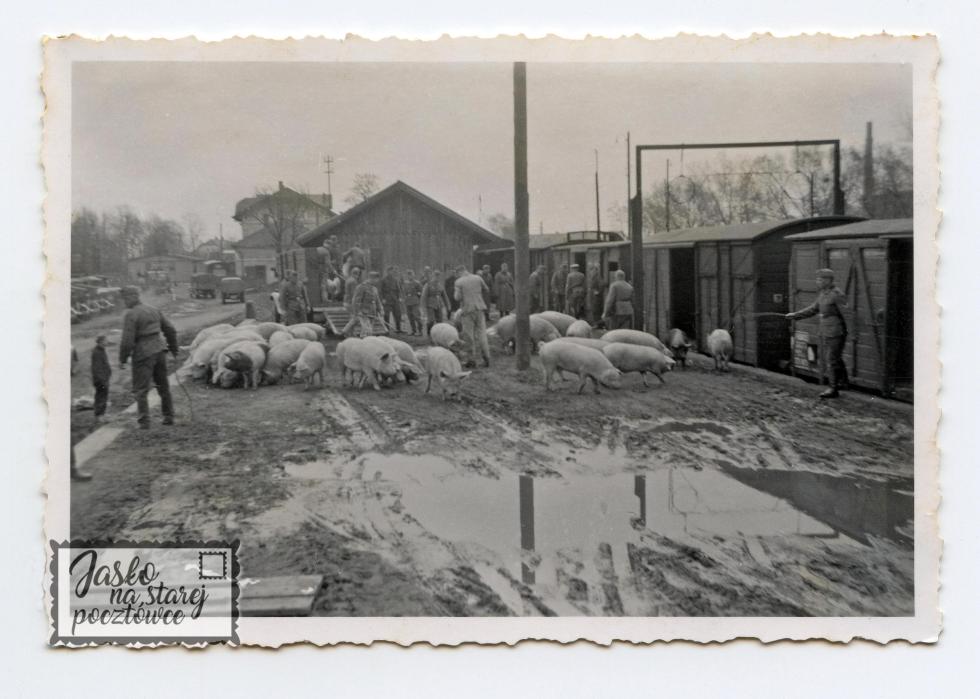 Zdjęcie małoobrazkowe: 6.0 X 9.0 cm. Załadunek świń do wagonów kolejowych. Załadunku dokonują żołnierze niemieccy.