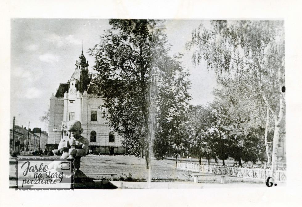 Fontanna z grajkiem znajdowała się przy ul. 3 Maja (dzisiaj H. Kołłątaja). W głębi Kasa Oszczędności. Zdjęcie małoobrazkowe (6.5 X 9.0 cm.)