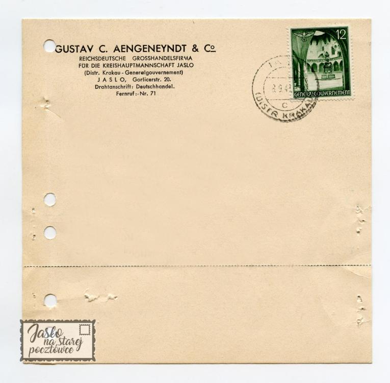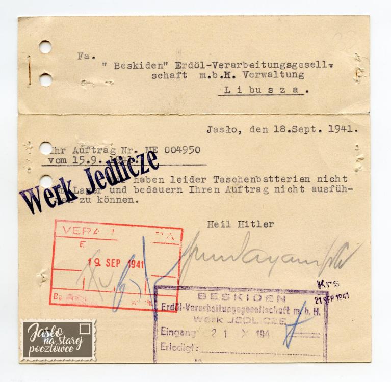 Oryginalne tłumaczenie pieczęci na dokumencie : ”Firma Handlowa Reprezentująca Rzeszy Niemiecką na Starostwo Jasło”. Treść pisma: ”Nie mamy niestety w magazynie kieszonkowych baterii i żałujemy, że nie możemy zrealizował waszego zamówienia ”