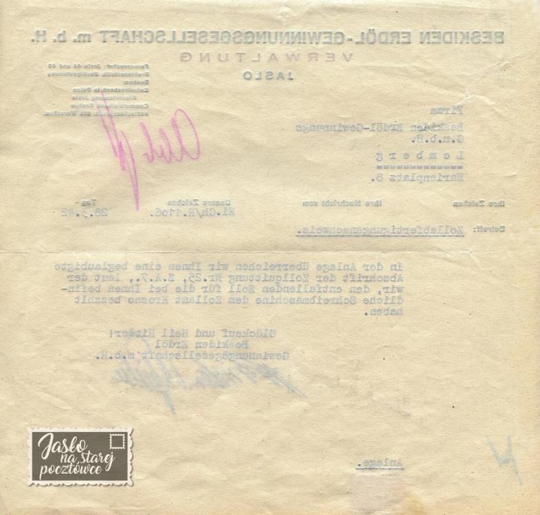 Dowód odprawy celnej wysłany ze Lwowa do Beskidzkiej Spółki Wydobycia Oleju Skalnego z o. o., Administracja w Jaśle. Treść pisma: ”W załączeniu przekazujemy Wam uwierzytelniony odpis kwitu celnego nr 25, Z. A. 7 urząd celny 7, zgodnie z którym zapłaciliśmy do urzędu celnego w Krośnie przypadające cło za znajdująca się u Was maszynę do pisania Gluckauf ” , Pismo kończy się życzeniami dla górników ”szczęśliwie na górę z kopalni” . Na końcu jak zawsze: ”Heil Hitler ” - niech żyje Hitler.