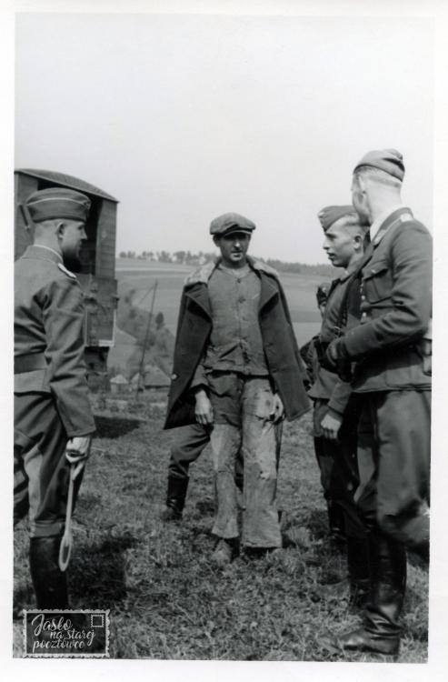 Zdjęcie małoobrazkowe, nierozpoznane, pochodzi z albumu niemieckiego oficera, pod zdjęciem widniał napis, Jasło 1941 r. Może ktoś z Państwa, rozpozna mężczyznę rozmawiającego z niemieckimi żołnierzami.