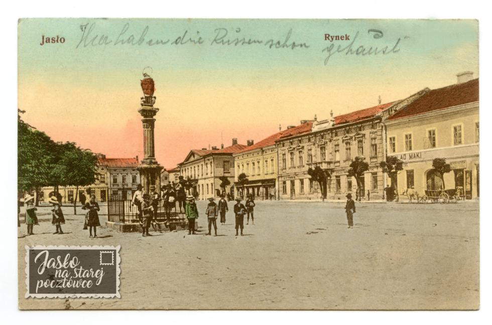 Na pierwszym planie figura św. Jana Nepomucena. Figura świętego na jasielskim rynku stanęła w 1770 roku i w stanie niemalże niezmienionym przetrwała do dnia dzisiejszego.
