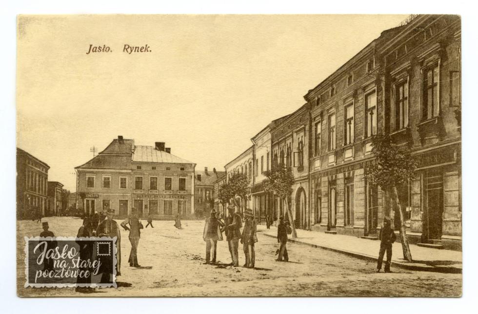 Widok na południową część rynku. W głębi budynek, gdzie z prawej strony mieścił się Główny Skład żelaza, zaś z lewej był sklep i skład papieru J. Bernera - który był wydawcą pocztówek.