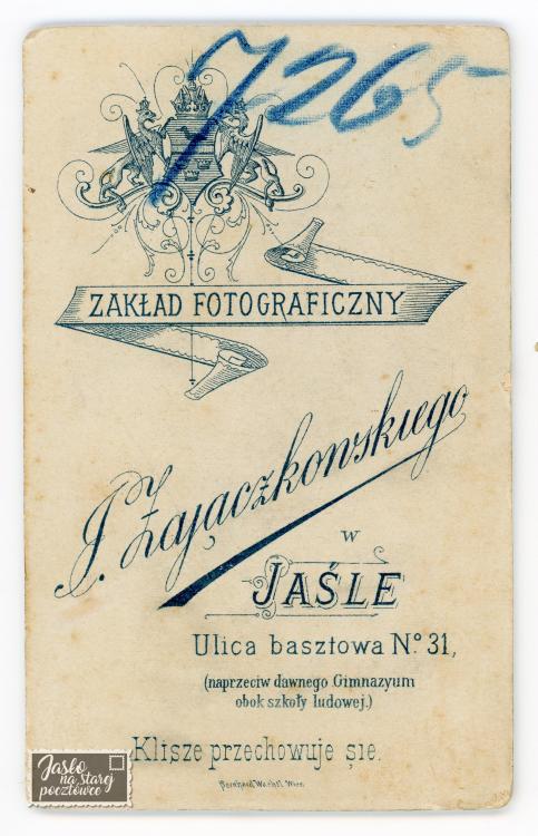 Zakład fotograficzny J. Zajączkowskiego Zakład mieścił się przy ul. Basztowej 31 Napszeciw dawnego Gimnazyum , obok szkoły ludowej ( pisownie oryginalna ) Wielkość zdjęcia : 6.8 x 10,6 Zdjęcie CDV ( Carte de visite ) Carte de visite -( fr. : [kart de vizit] , wizytówka ), w skrócie CDV , była rodzajem małej fotografii, którą opatentował w Paryżu fotograf André Adolphe Eugène Disdéri w 1854 r. Pierwszy raz użył jej Louis Dodero. Zwykle była zrobiona z nadruku na albumie, który był cienkim papierowym zdjęciem umieszczonym na grubszej papierowej karcie – grubszy kartonik.