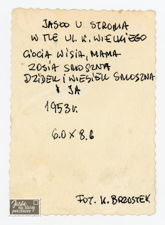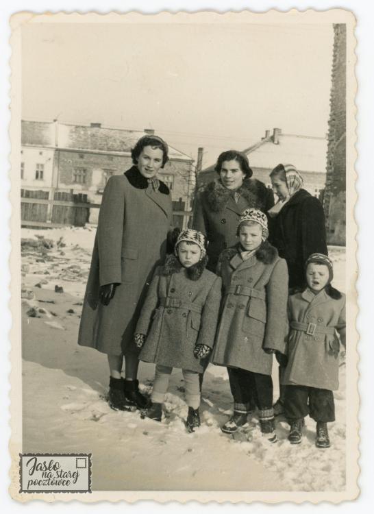 Ul. Stroma , w tle ul. K. Wielkiego - Ciocia Wisia , mama , kuzynka Zosia kuzyni Dzidek , Wiesiek Smoszna i ja 1953 r. Zdjęcie zostało zrobione w 1953 r. Zdjęcie wykonał : Kazimierz Brzostek , stolarz i renowator antyków . Zakład mieścił się przy ul. Igielnej.