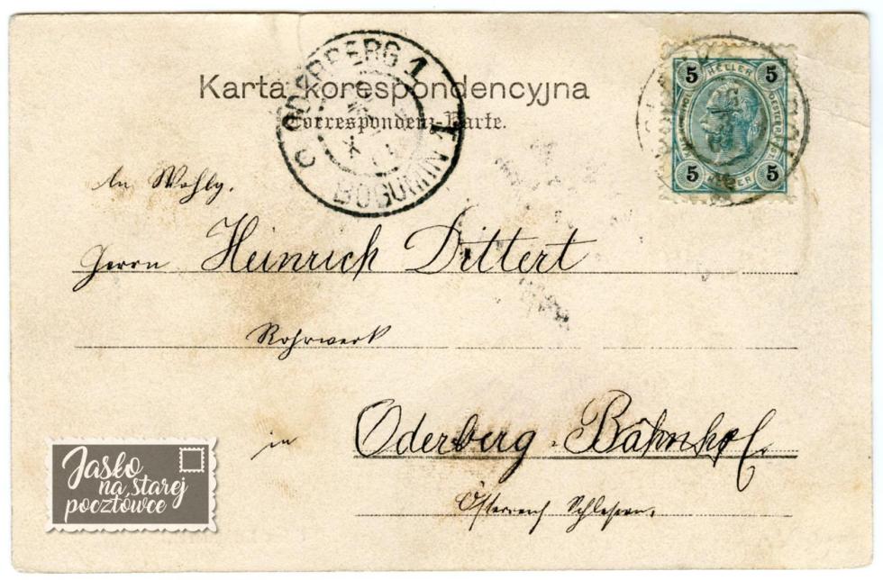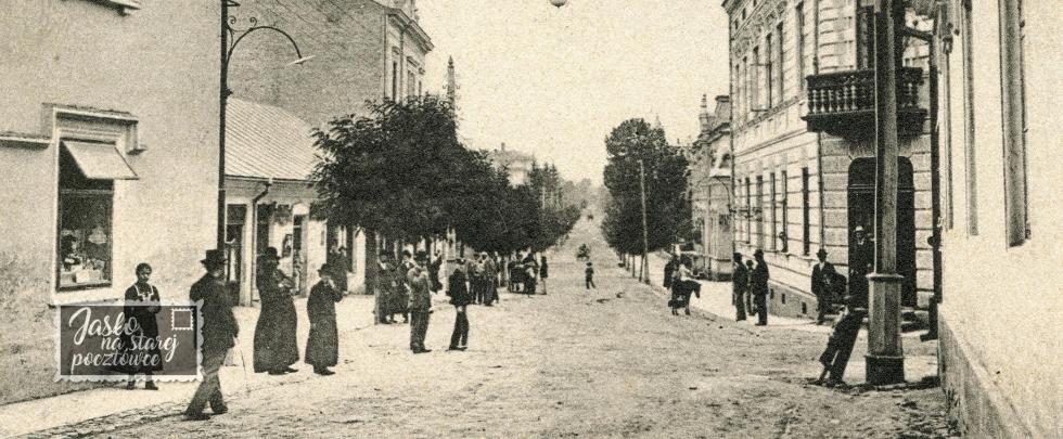 Powiększony fragment ul. Kościuszki, widok od rynku. Widoczna na pocztówce grupka ortodoksyjnych jasielskich żydów.