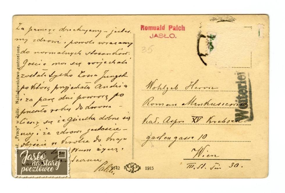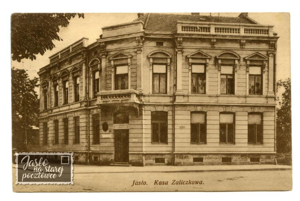 Budynek mieścił się przy dzisiejszym skrzyżowaniu ulic: Jana III Sobieskiego i H. Kołłątaja. Pocztówka wysłana przez znanego jasielskiego aptekarza Romualda Palcha .