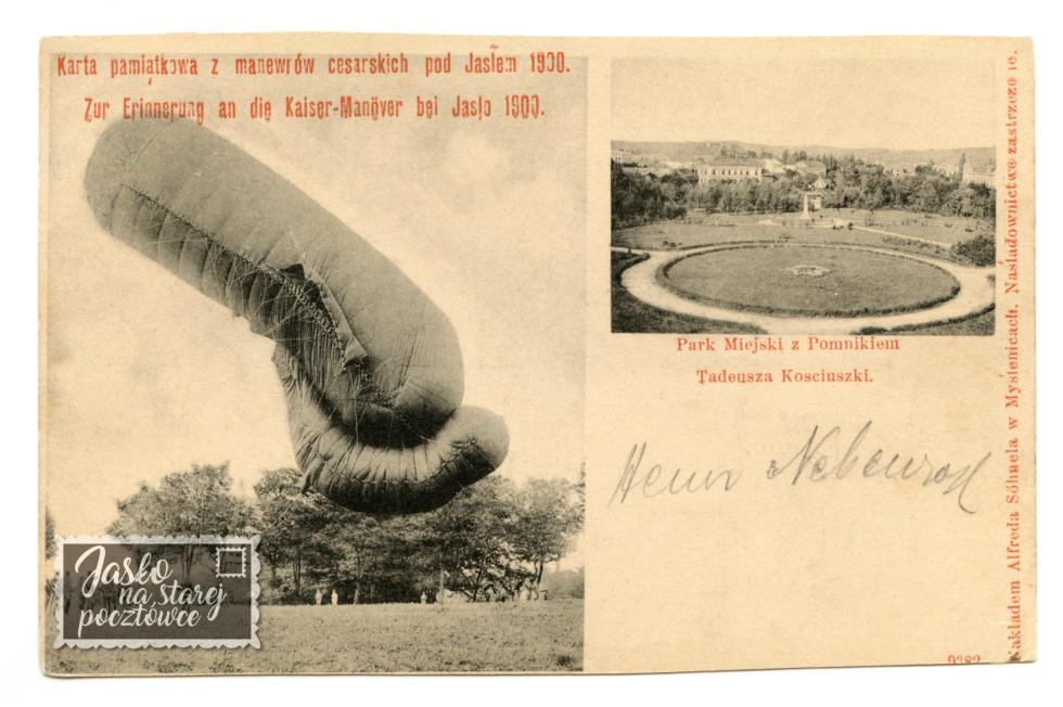 Karta pamiątkowa z manewrów cesarskich pod Jasłem w 1900 r. Balon i Park Miejski z pomnikiem T. Kościuszki.