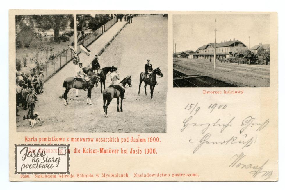 Karta pamiątkowa z manewrów cesarskich pod Jasłem w 1900 r. Cesarz Franciszek Józef I na koniu, Dworzec kolejowy.