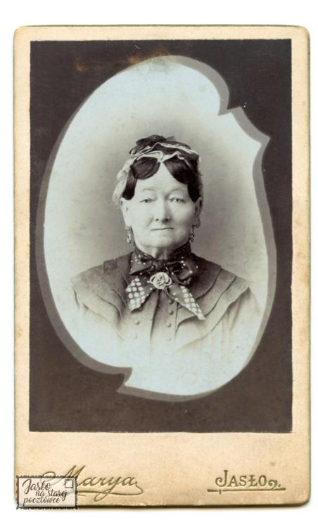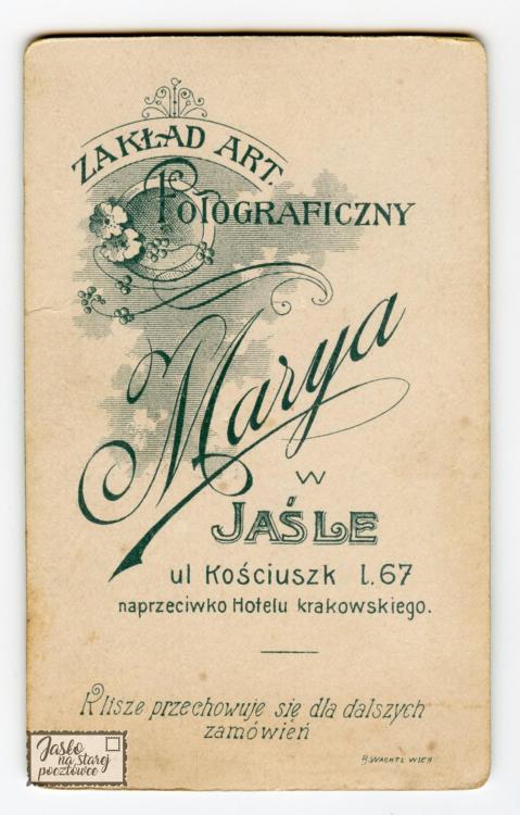 Zdjęcie na kartoniku o wymiarach: 6.7 X 10.6 cm. Z najpopularniejszą na rewersie litografią B. Wachtla (1852-1920). Zakład fotograficzny Jasło ul. Kościuszk (z błędem w opisie) nr. 67 naprzeciwko Hotelu Krakowskiego.