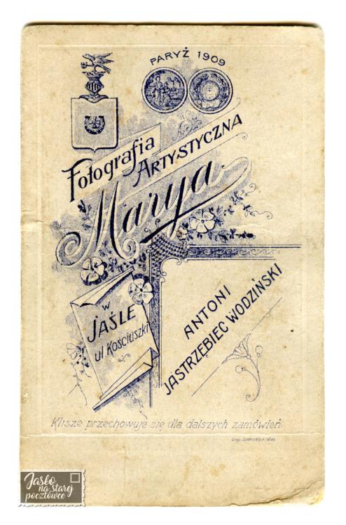 Zdjęcie na kartoniku o wymiarach: 5 7.6 X 11.9 cm. Z najpopularniejszą na rewersie litografią. Fotograf Antoni Jastrzębiec Wodziński (Jastrzębiec to tytuł szlachecki - herb rodu fotograf zamieścił na kartoniku w lewym górnym rogu). Zmarł w Jaśle w wieku 54 lat.