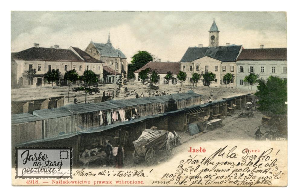 Od prawej, stary ratusz, kościół farny, narożna kamienica istniejąca do dnia dzisiejszego.