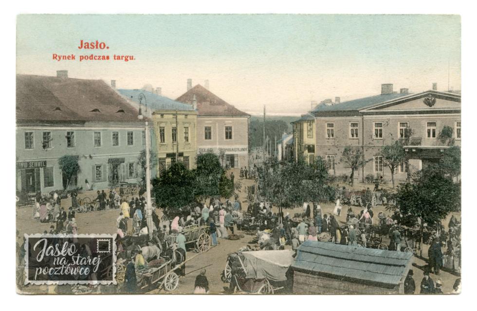 Rynek podczas targu. Północno - zachodni fragment rynku. W głębi ul. Kazimierza Wielkiego.