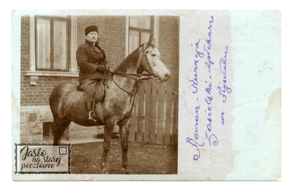 Pocztówka fotograficzna przedstawia jasielskiego aptekarza Romana Kurzej. Jeżeli ktoś z Państwa zna więcej szczegółów dotyczących tej fotografii, serdecznie proszę o kontakt.
