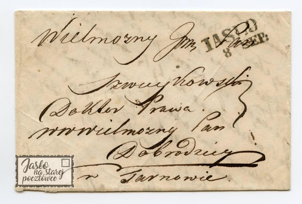 List wstępny wysłany z Jasła do Wielmożnego Pana Dobrodzieja Szwajkowskiego, Doktora Prawa, zamieszkałego w Tarnowie.