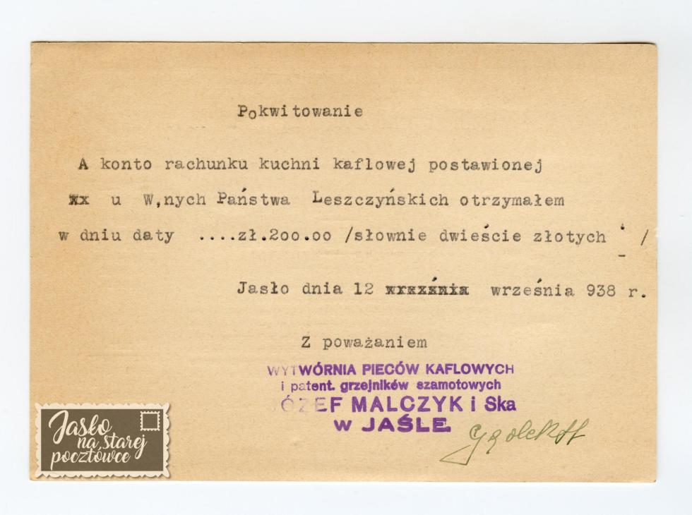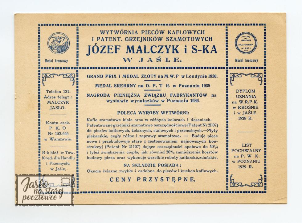 ”Firmówka ” Wytwórnia Pieców Kaflowych i Patentowych Grzejników Szamotowych. Józef Malczyk i s-ka w Jaśle.