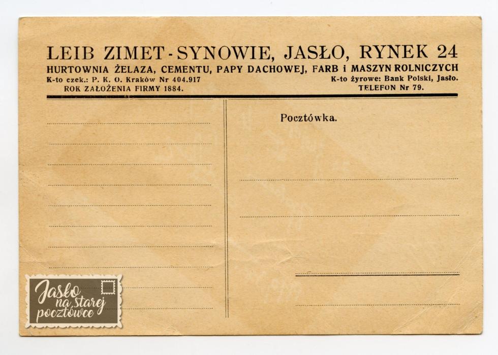 ”Firmówka ” Leib Zimet-Synowie, Jasło, Rynek 24. Hurtownia Żelaza, Cementu, Papy Dachowej, Farb i Maszyn Rolniczych.