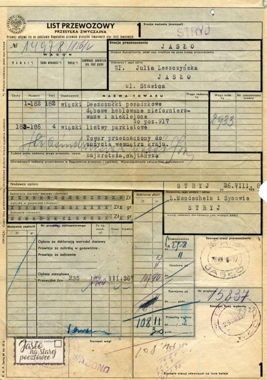 ”Firmówka ” List przewozowy ze Stryja od L. Mondschein i Synowie do Jasła .
