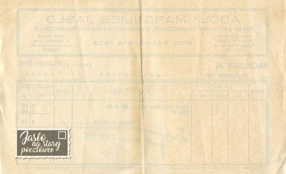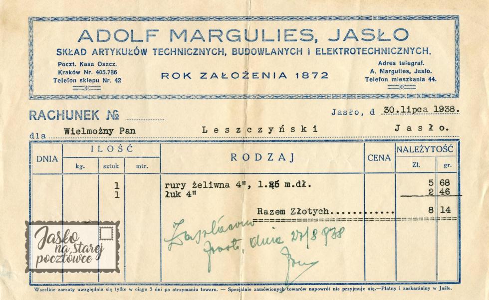”Firmówka ” Adolf Margulies, Jasło. Skład Artykułów Technicznych, Budowlanych i Elektrotechnicznych.