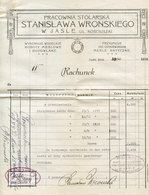 ”Firmówka ” Pracownia Stolarska Stanisława Wrońskiego w Jaśle ul. Kościuszki.