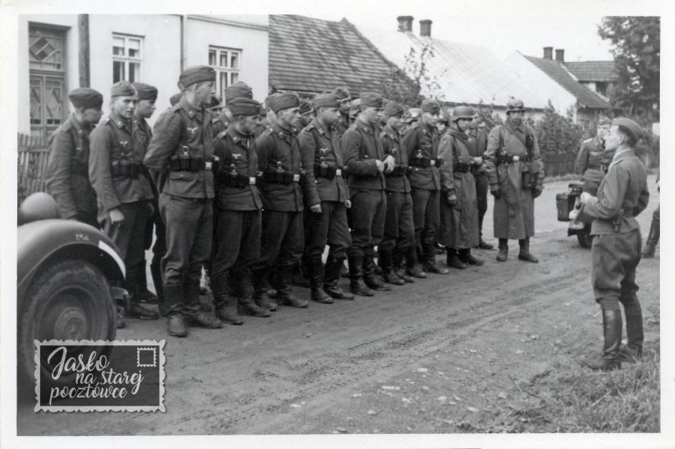 Zdjęcie małoobrazkowe, pochodzi z albumu niemieckiego oficera , pod zdjęciem widniał napis , Jasło 1941 r. Jasło ul. Lwowska. Dom , pierwszy z lewej zachował się do dnia dzisiejszego. Treść opisu zdjęcia : ” żołnierze niemieccy (kierowcy ) otrzymują jeszcze raz dokładne wskazówki ” .