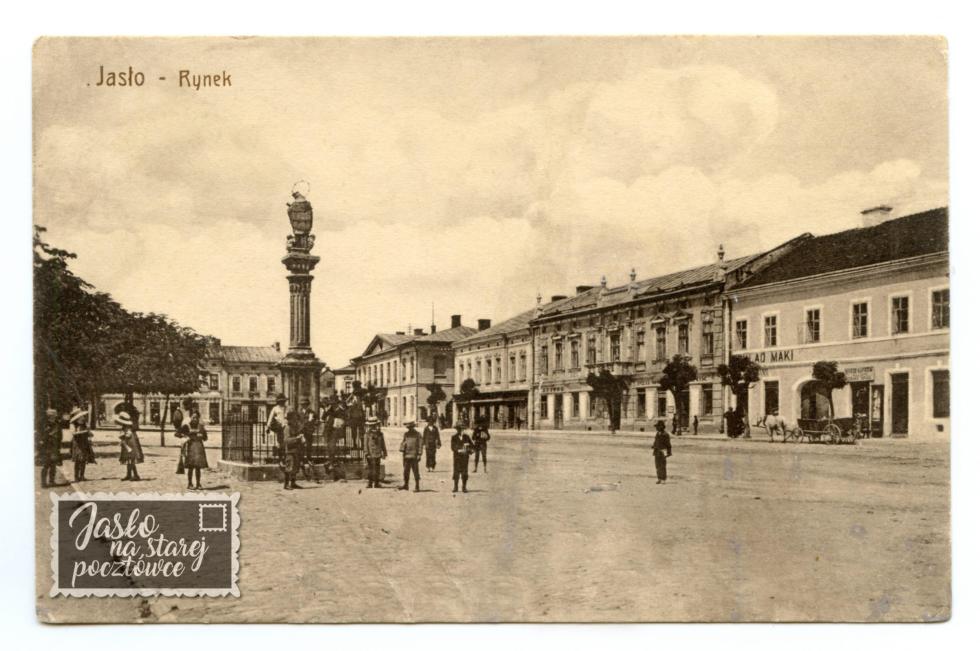 Na pierwszym planie figura św. Jana Nepomucena. Figura świętego na jasielskim rynku stanęła w 1770 roku i w stanie niemalże niezmienionym przetrwała do dnia dzisiejszego.