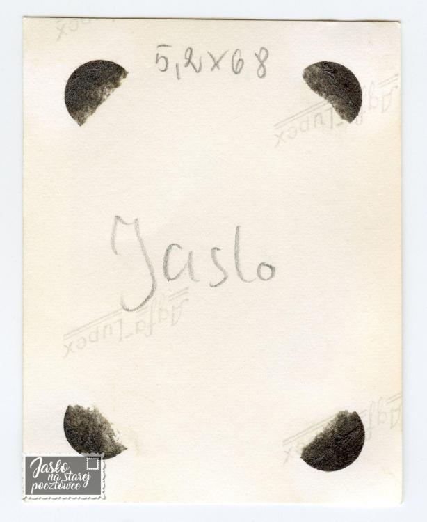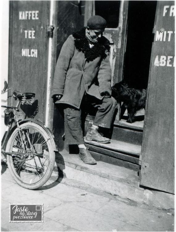 Mieszkaniec Jasła przed sklepem. Zdjęcie małoobrazkowe : 6.8 x 5.2 cm.