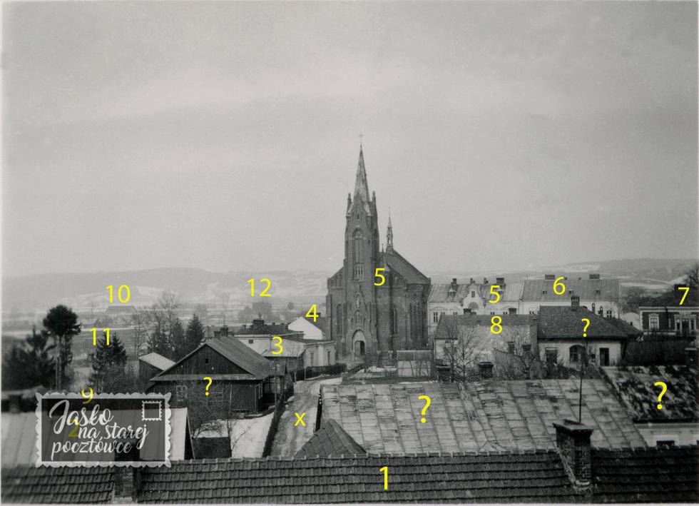 11. Przed domem pana Siekierzyńskiego mało widoczne trzy domki: a. Dom pana Guni b. Dom pana Szpaka – wozak, który rozwoził różne towary c. Dom pana Gorczycy , strażak w jasielskiej Straży Pożarnej. Domy znajdowały się na lewym brzegu Jasiołki przy ul. Szajnochy.