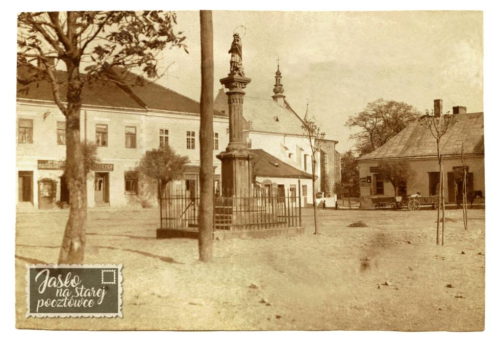 Apolinary Kotowicz , oryginalna fotografia sprzed pierwszej wojny światowej . Rynek , jasielska Fara , figura Jana Nepomucena.