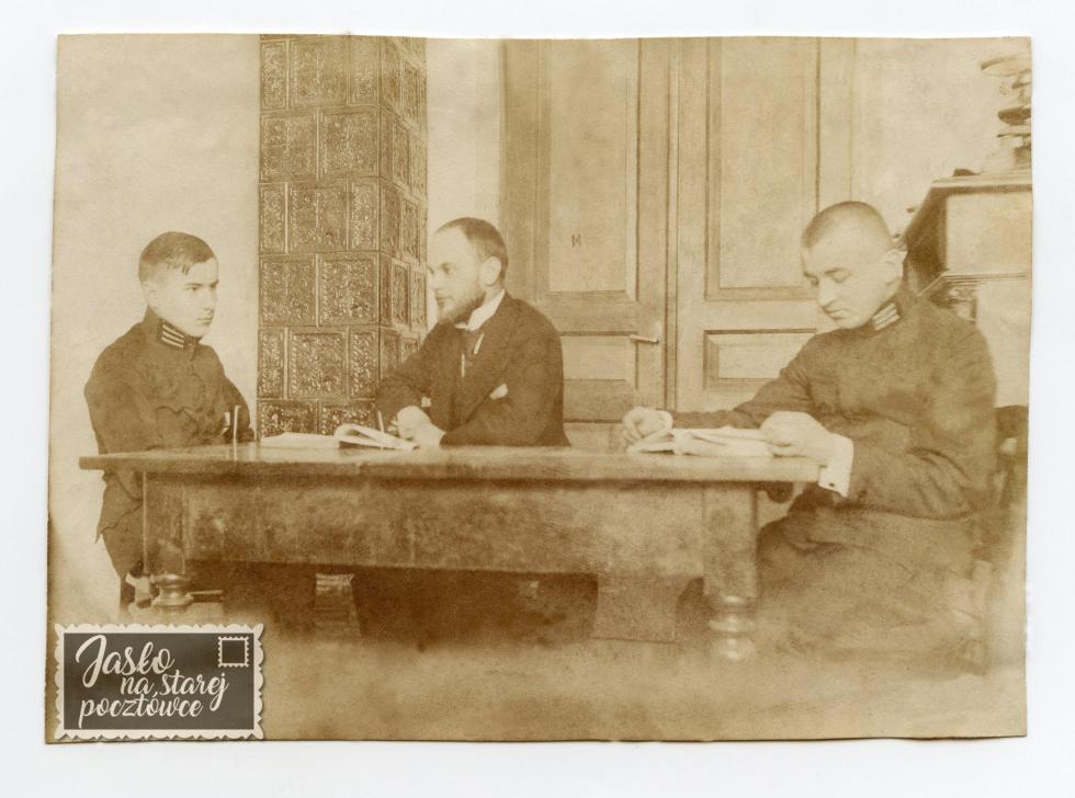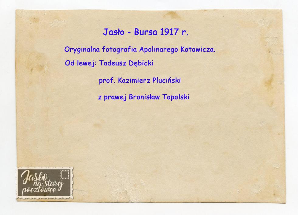 Apolinary Kotowicz , oryginalna fotografia . Jasielska Bursa - odrabianie lekcji 1917 r. Od lewej : Tadeusz Dębicki , prof. Kazimierz Pluciński i Bronisław Topolski.