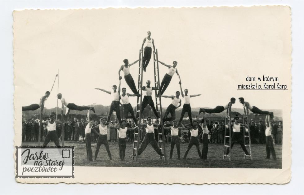 Pokaz gimnastyczny Towarzystwa Gimnastycznego ” Sokół ”Stadion J.K.S. ” Czarni ” Jasło Z prawej dom , w którym mieszkał p. Karol Karp.