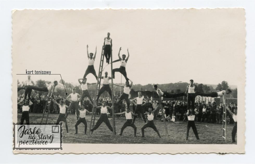 Pokaz gimnastyczny Towarzystwa Gimnastycznego ” Sokół ”Stadion J.K.S. ” Czarni ” Jasło Po lewej stronie widoczny kort tenisowy.