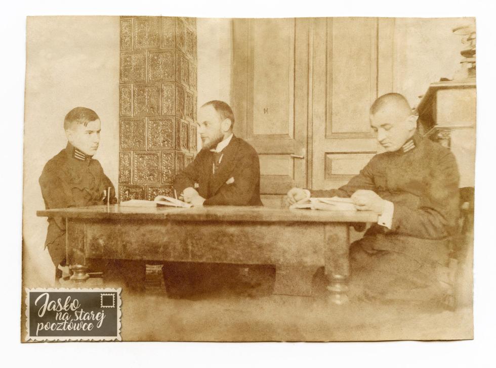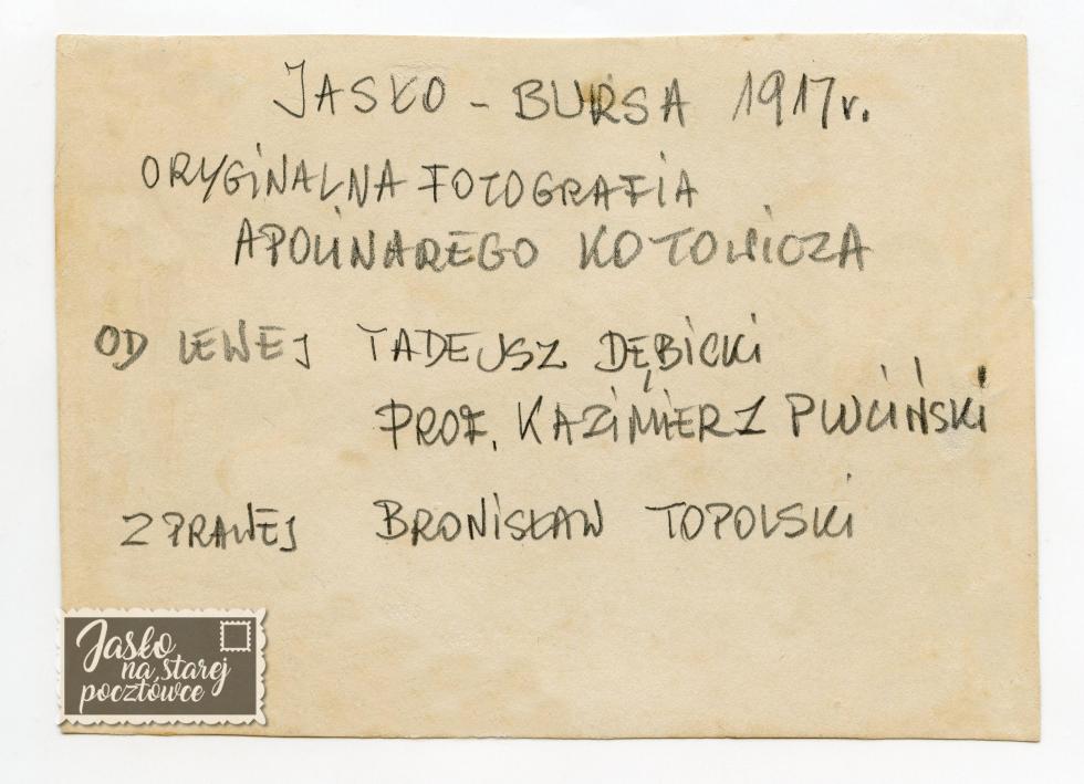 Apolinary Stanisław Kotowicz. Ur. 24 marca 1859 w Bieczu, zm. 21 kwietnia 1917 w Jaśle.Polski malarz pejzażysta, twórca scen rodzajowych, portrecista, dekorator teatralny, fotograf amator. Od lewej: uczeń Tadeusz Dębicki, nauczyciel prof. Kazimierz Pluciński i uczeń Bronisław Topolski.