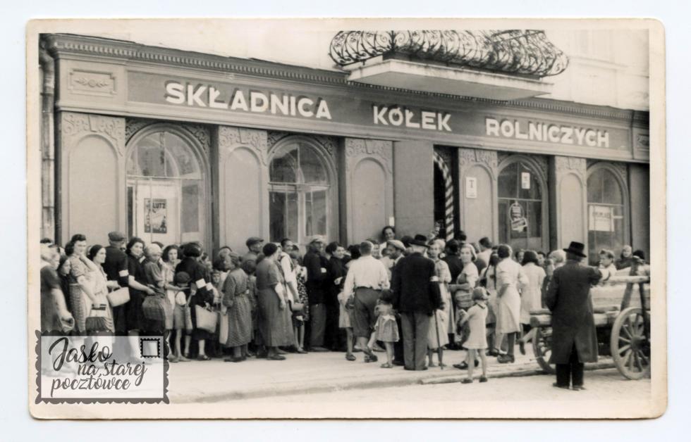 Składnica Kółek Rolniczych. Na zdjęciu jasielscy Żydzi , wielu z opaskami stoją po tzw. ”przydział” W Składnicy Kółek Rolniczych mieścił się sklep spożywczo – żelazny. Składnica znajdowała się na rogu południowej strony Rynku i początku ulicy Kościuszki. Po zniszczeniu Jasła wyburzona została całkowicie. Obecnie na części tego miejsca stoi budynek , w którym jest cukiernia ” Santos”, oraz sklep z telefonami. Druga połowa tej parceli została włączona w celu poszerzenia ulicy Kościuszki wraz z chodnikiem.