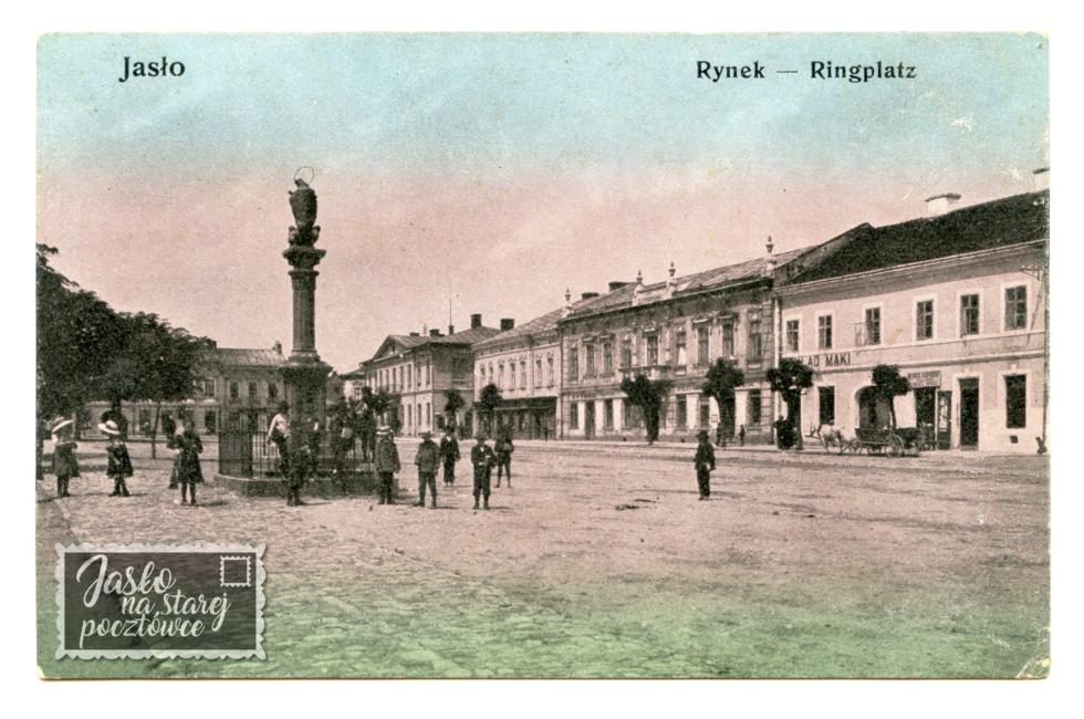 Na pierwszym planie figura św. Jana Nepomucena. Figura świętego na jasielskim rynku stanęła w 1770 roku i w stanie niemalże niezmienionym przetrwała do dnia dzisiejszego.