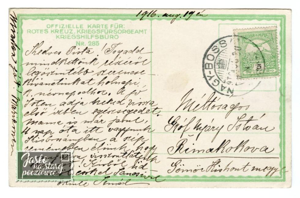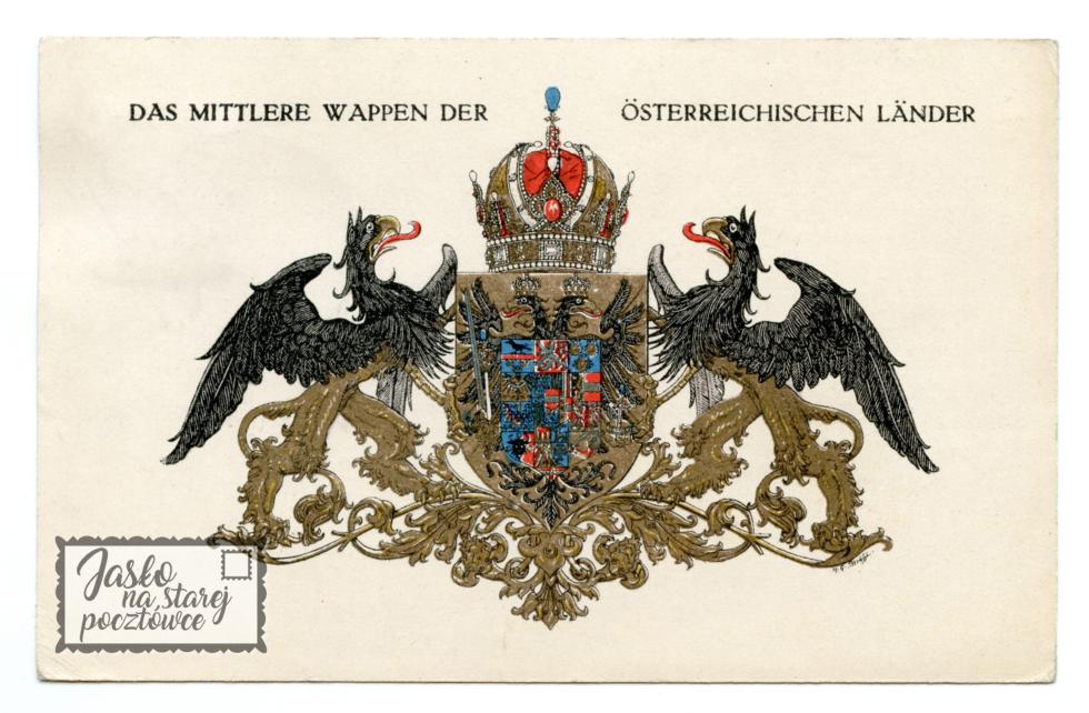 Oficjalna kartka Czerwonego Krzyża nr. 285. Małe godło krain należących do Austrii.