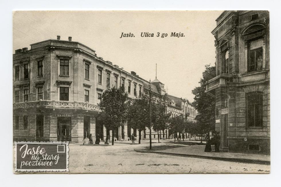 Skrzyżowanie ulic : 3 Maja (dzisiaj H. Kołłątaja) ul. Asnyka i ul. Jana III Sobieskiego. Na wprost cukiernia, z prawej strony Kasa Zaliczkowa.