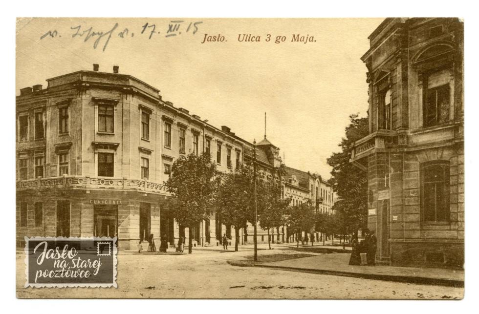 Skrzyżowanie ulic :3-go Maja (dzisiaj H. Kołłątaja) ul. Asnyka i ul. Jana III Sobieskiego. Na wprost cukiernia, z prawej strony Kasa Zaliczkowa.