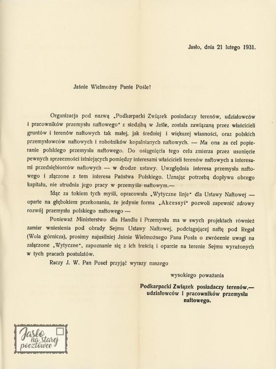 Organizacja \" Podkarpacki Związek posiadaczy terenów , udziałowców i pracowników przemysłu naftowego \" w Jaśle.