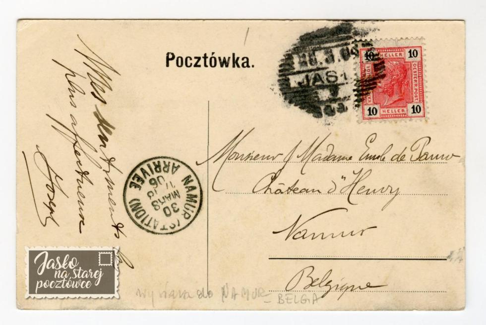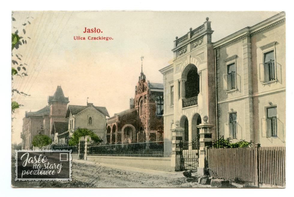 Dawna ul. Czackiego dzisiaj ul. St. Staszica. Widok w kierunku dworca kolejowego. Pocztówka wysłana z Jasła do miejscowości Namur w Belgii.