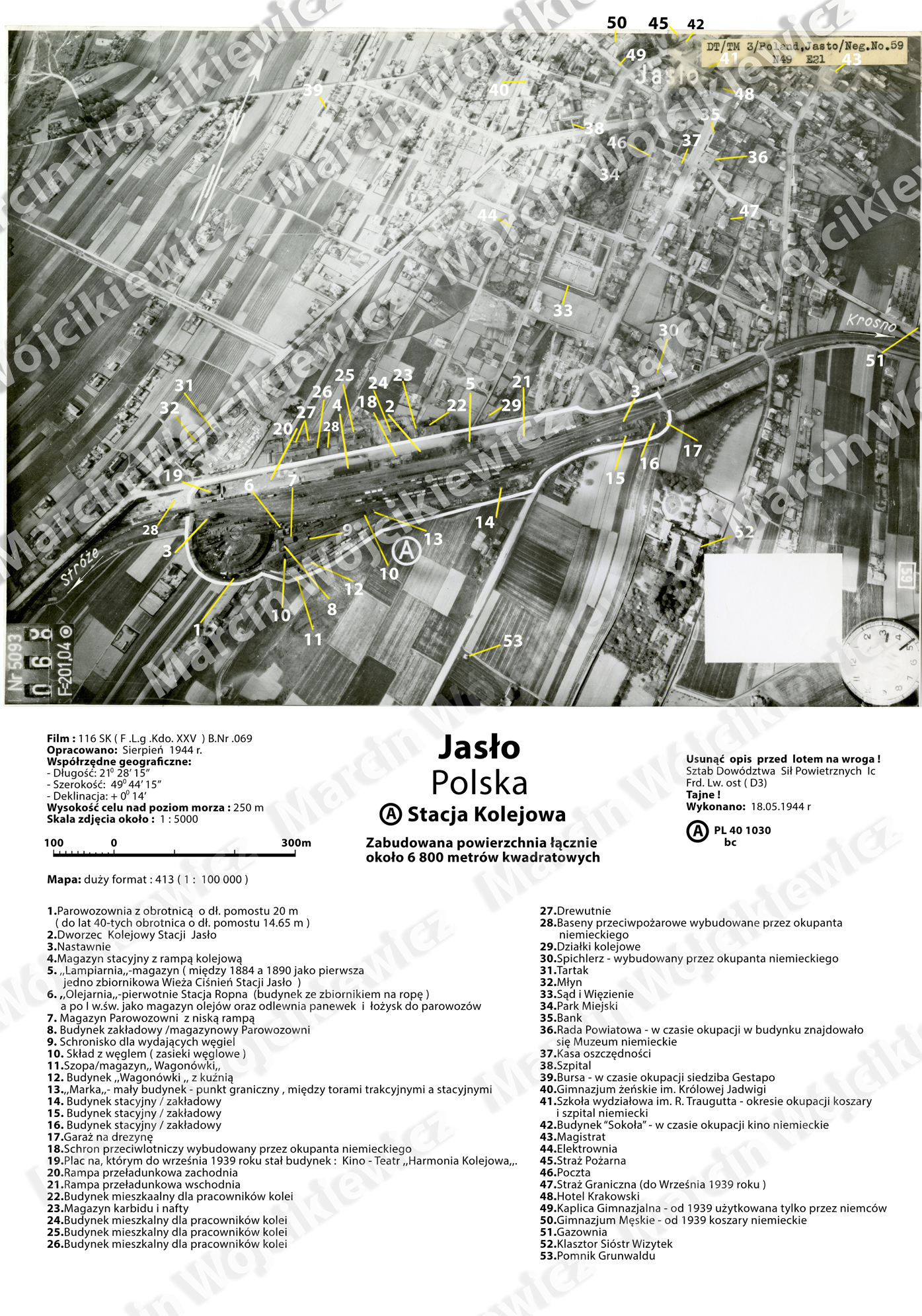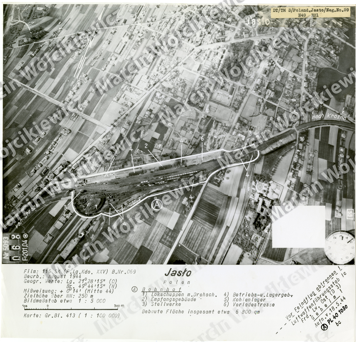 "Zdjęcie lotnicze: Stacja Kolejowa Jasło z częścią Miasta Jasła" wykonane przez lotnictwo niemieckie 18 Maja 1944 roku o godzinie 15:24